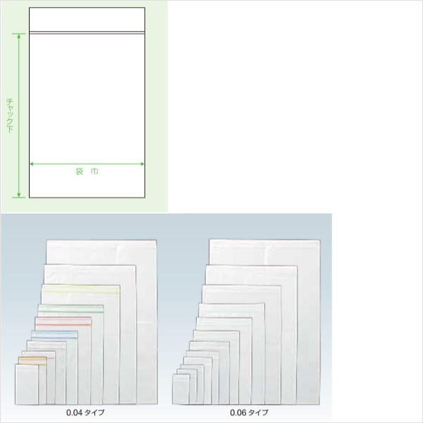 チャック付ポリプロピレン袋です。サイズ別にチャックにカラー着色がしてあり、繊維製品、日用雑貨品、乾燥農水産加工品などにご利用いただけます。