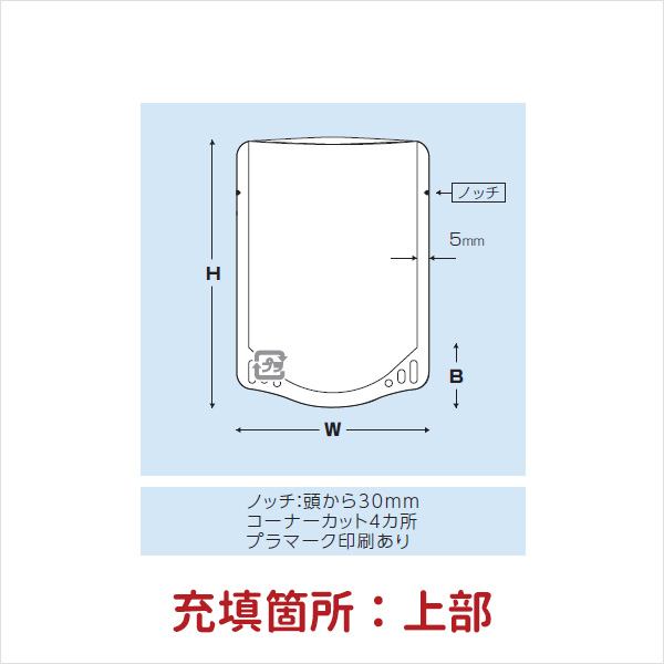 | 仕様 | ■5mmシール ■コーナーカット ■ノッチ付 ■レトルト殺菌(130℃ 30分) |