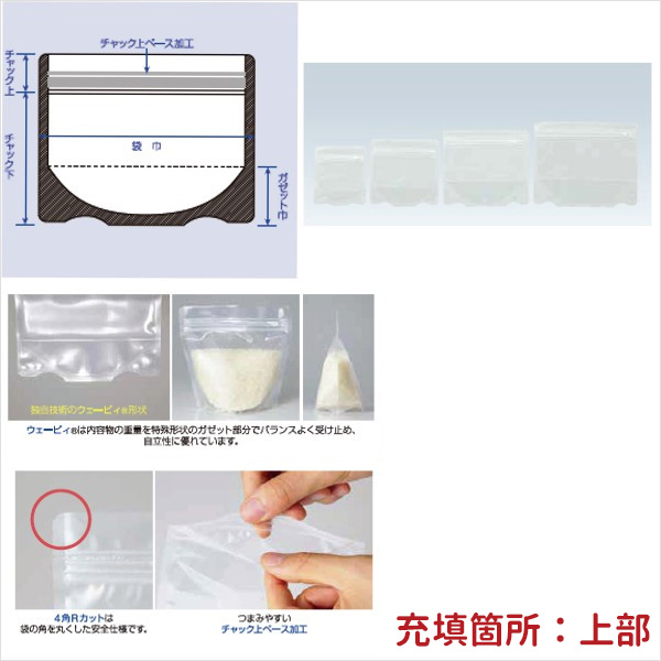 | 仕様 | ■サイド6mmベタシール ■底ウェービィ形状 ■4角Rカット ■チャック上ベース加工 ■冷凍(マイナス30℃) |